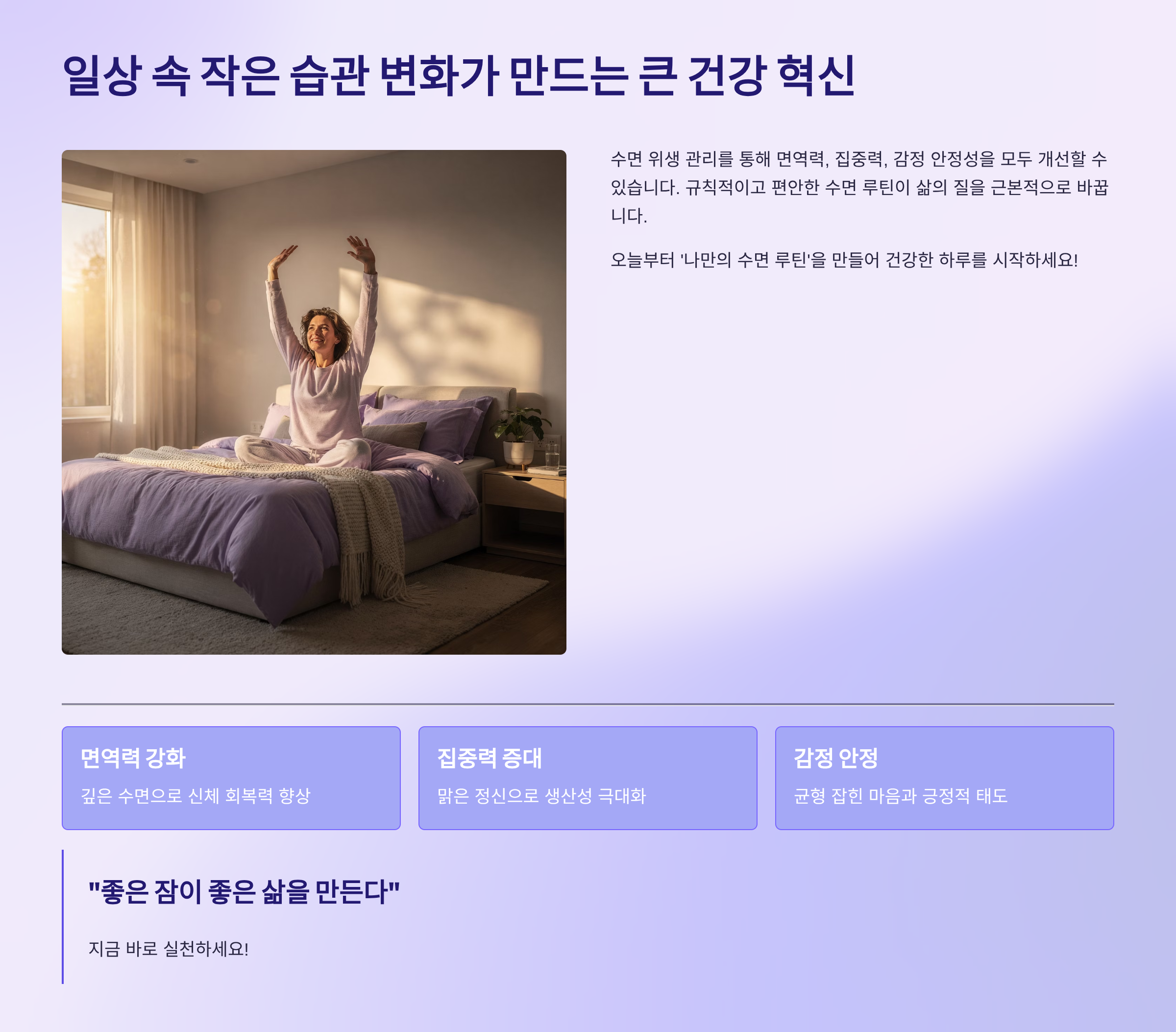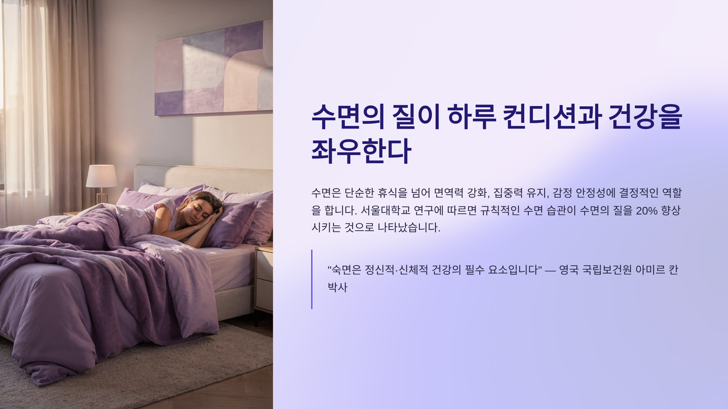 수면의 질은 하루 컨디션뿐 아니라 면역력, 집중력, 감정 조절까지 영향을 미칩니다. 단순한 수면시간보다 ‘어떻게 자느냐’가 더욱 중요하다는 점! 오늘 소개한 6가지 습관을 하나씩 실천해보세요. 내일 아침이 분명 달라질 거예요.