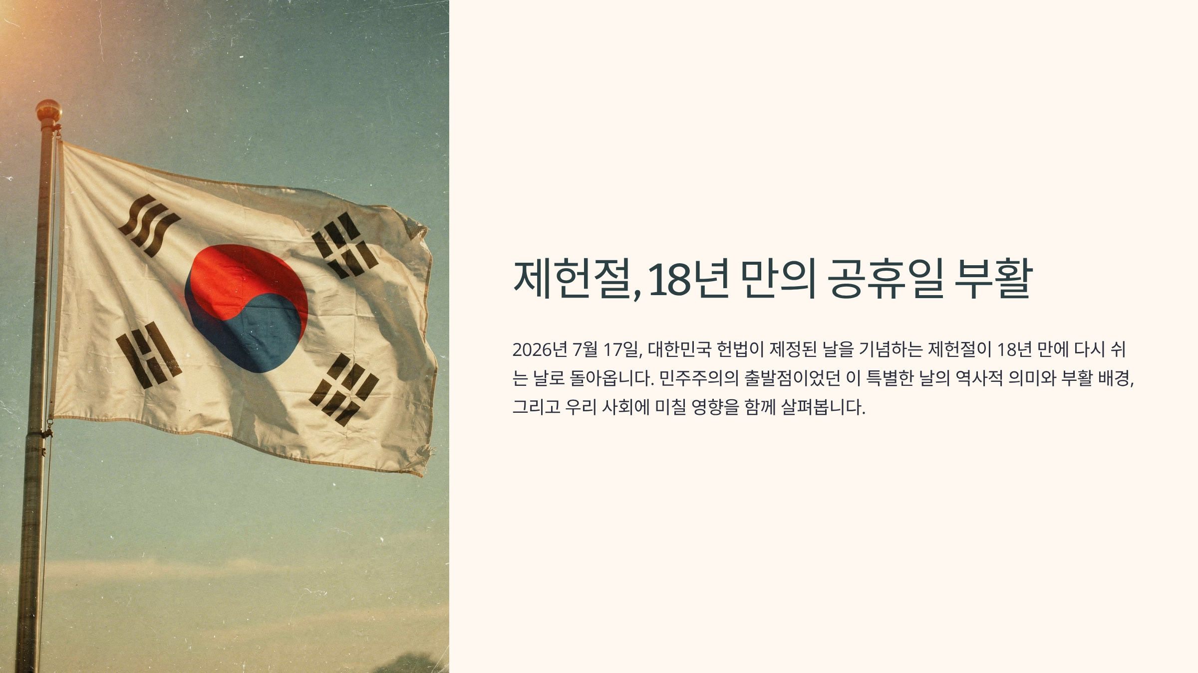 2026년 7월 17일 제헌절이 **18년 만에 다시 공휴일(빨간날)**로 지정되었습니다. 그동안 국경일 중 유일하게 쉬는 날이 아니었던 제헌절이, **국회 본회의에서 공휴일법 개정안이 가결됨으로써 부활하게 된 것입니다.