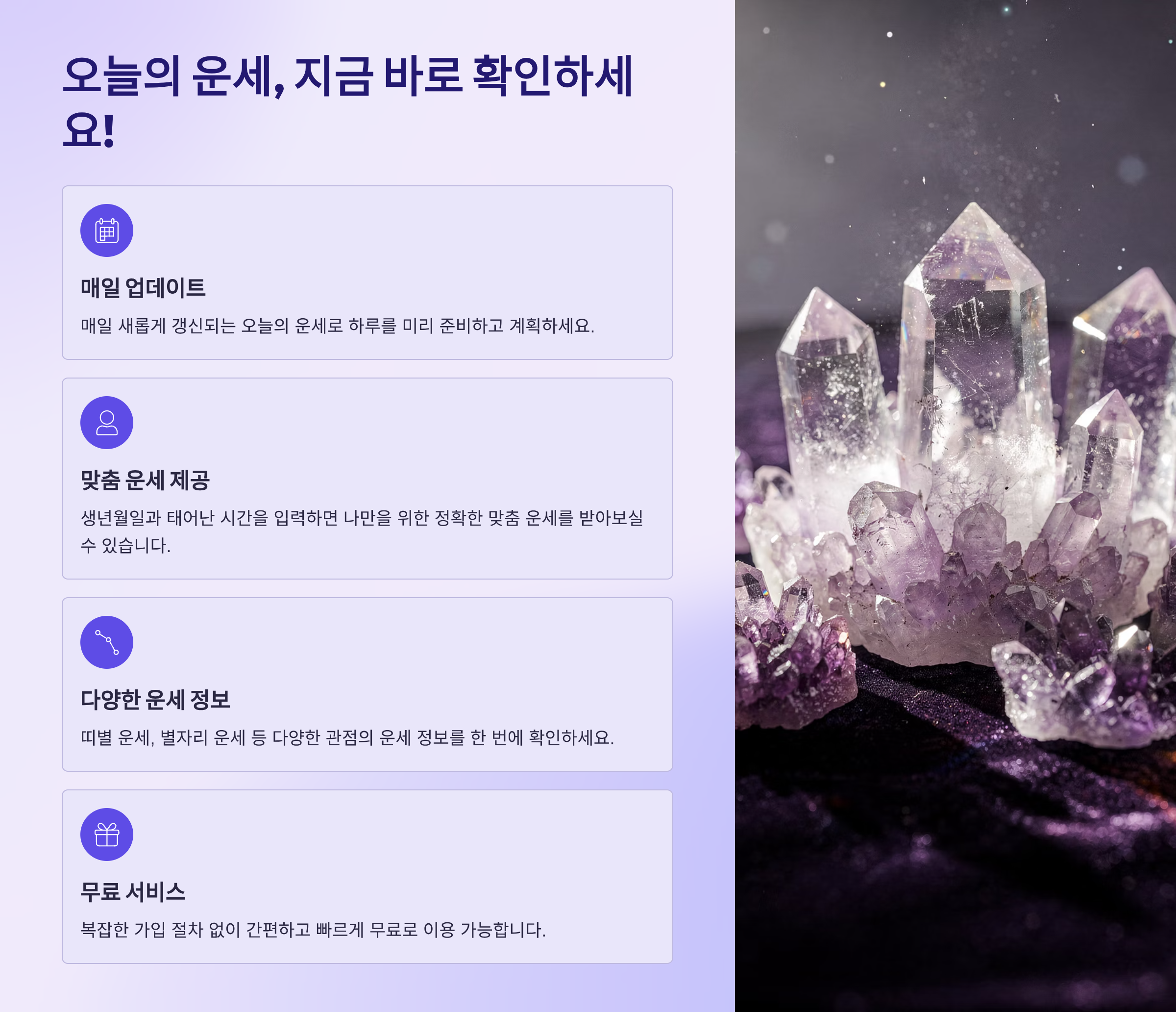 회원가입 없이 생년월일만 입력하면 운세를 확인할 수 있습니다. (띠/별자리 자동)