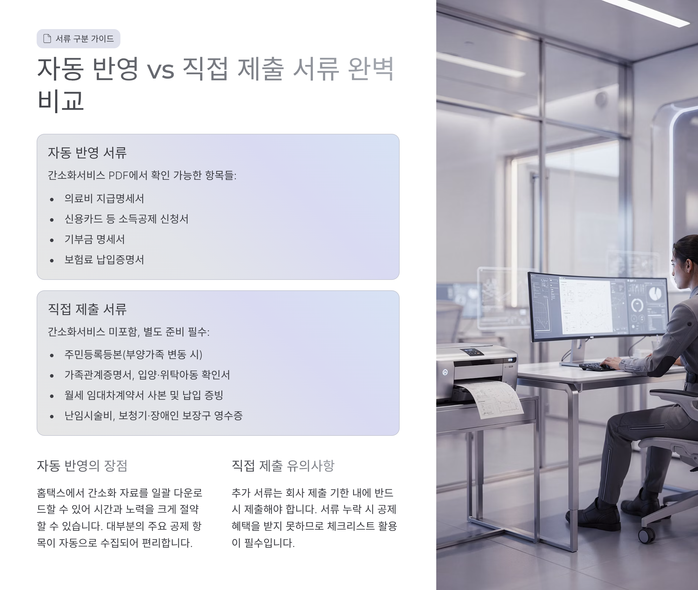 단, 일부 항목은 본인이 직접 서류를 제출하거나 간편화 서비스에 등록 요청해야 반영됩니다. 따라서 어떤 서류가 자동 수집되고, 어떤 것은 직접 챙겨야 하는지 아는 것이 중요합니다.